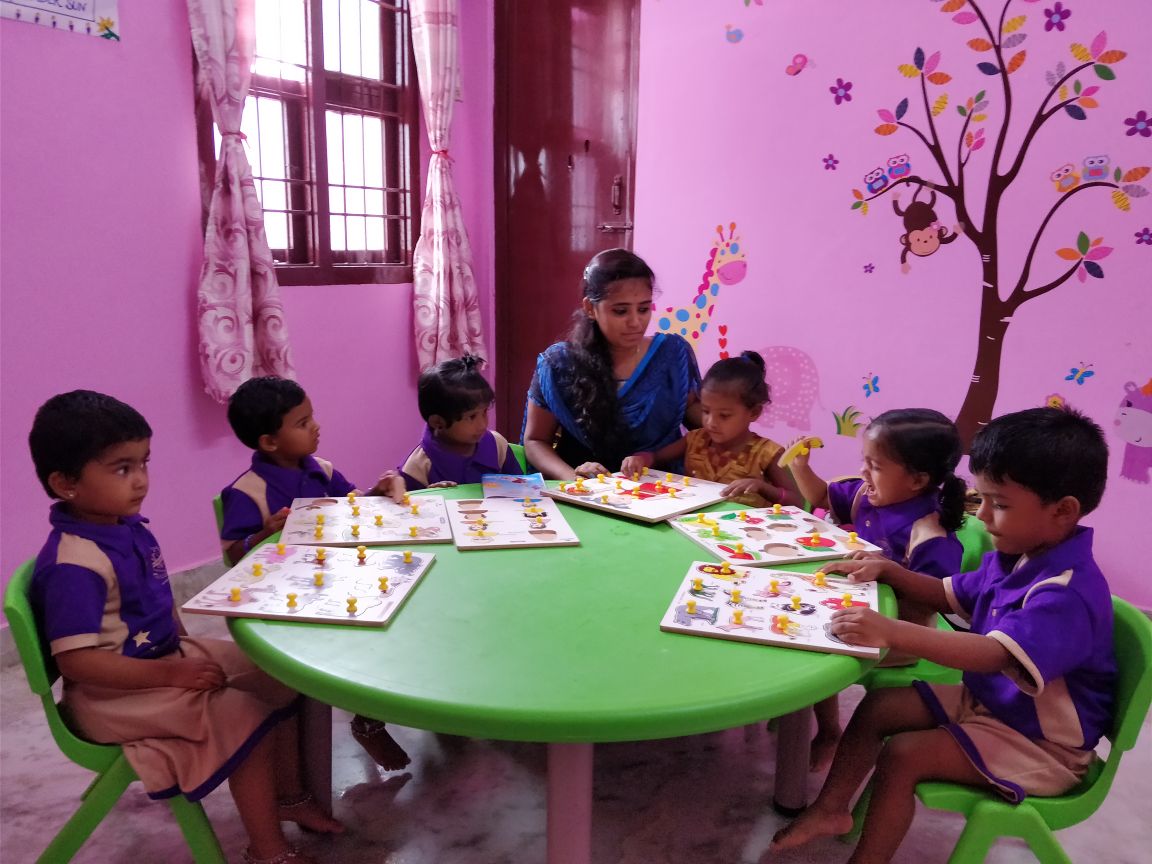 Through these activities, children learn the alphabets and letter sounds, numbers and simple maths and master early writing skills.